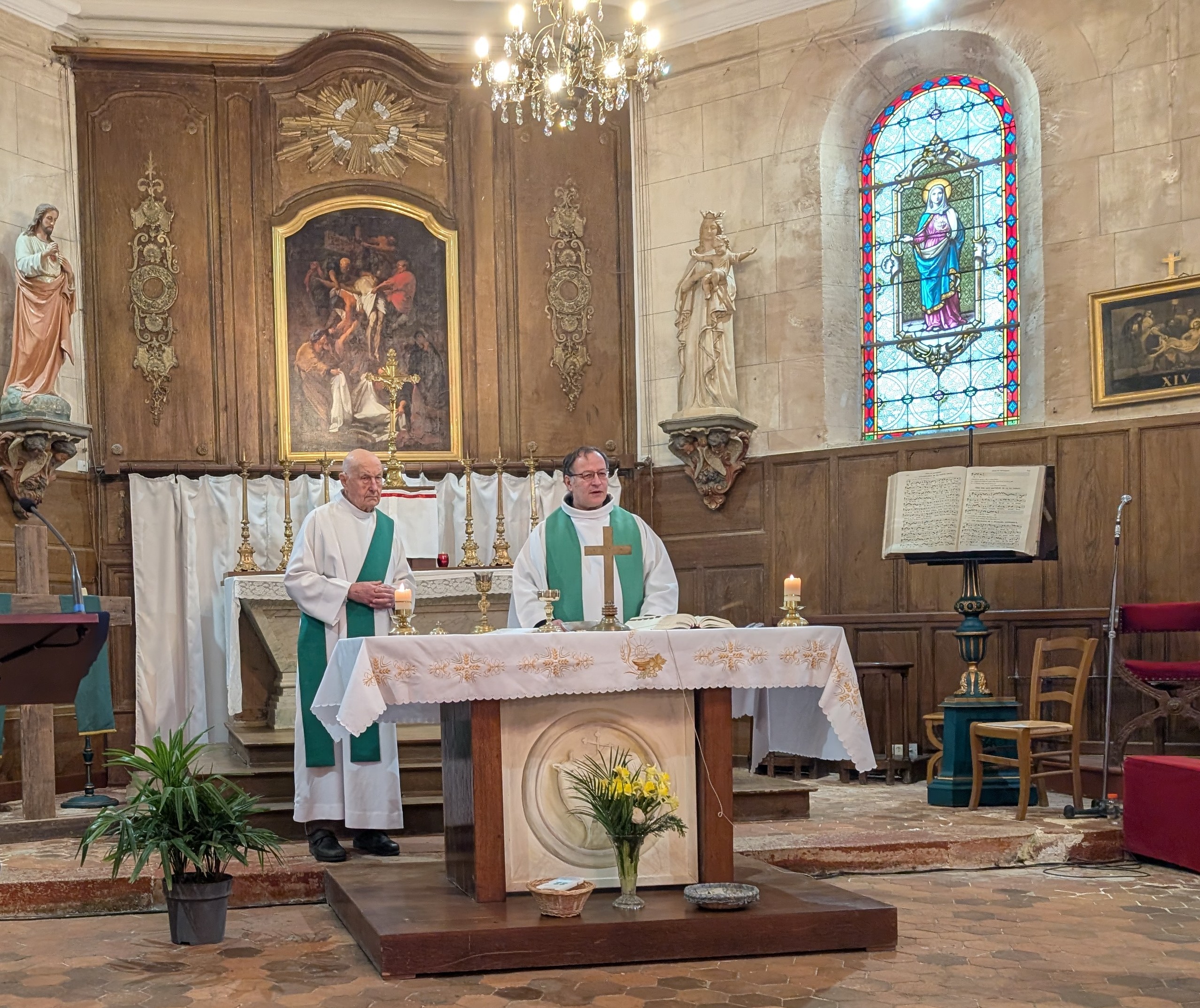 La Vierge Pélerine continue ses visites à Chars : 14 familles l’ont déjà accueillie, elle était aussi présente lors de la messe à la maison de retraite des Sansonnets.